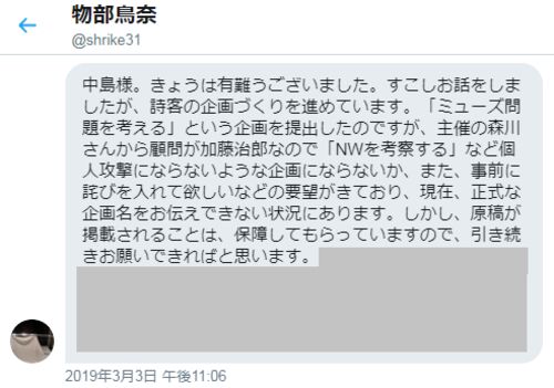 ここで、2019年5月4日に、詩客に玲・濱松・中島の短歌時評が掲載されるまでと、その少し後までの流れを確認しておきます。ここでは、大変残念ながら、加藤が玲に対して行った脅迫について扱うことになります。 玲による時系列の整理 2019年2月上~中旬:詩客…